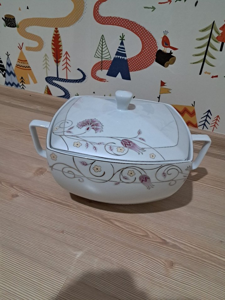 Çiçek desenli beyaz porselen kapaklı corba tenceresi, her iki yanında taşıma kulpları bulunur.