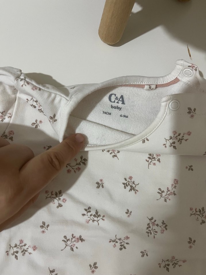 Beyaz, pastel çiçek desenli kız bebek tulumu, kolay giydirme için fermuarlı ve C&A baby markasına ait. 6-9 ay arası uygundur.