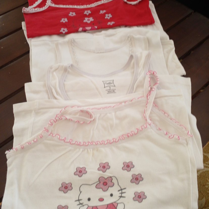 Beyaz zemin üzerine pembe çiçekler ve sevimli kedi desenli, fırfırlı askılı kız çocuk atlet 5adet fiyatıdır iyi durumdalar iade almıyorum belirtiyim