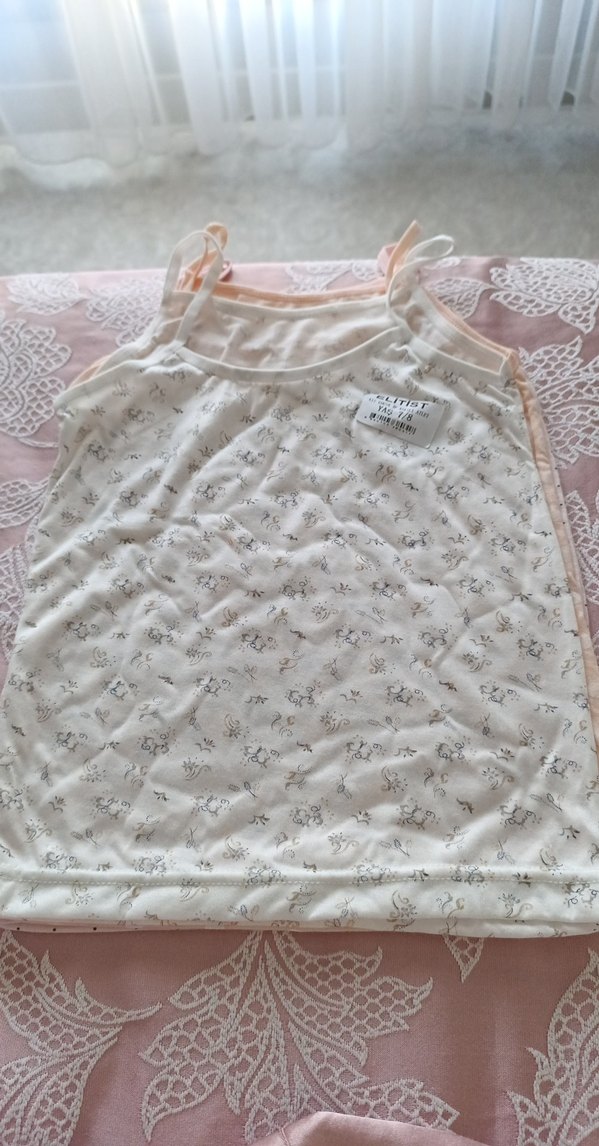 Beyaz zemin üzerinde ince çiçek desenleri bulunan, ince askılı ve yumuşak kumaştan yapılmış kız çocuk atletidir.