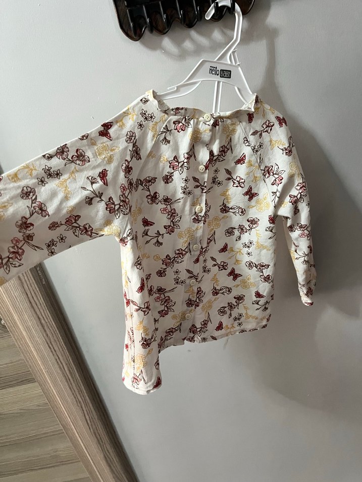 Uzun kollu, yuvarlak yakalı ve fırfırlı detaylı, bol kesim beyaz çiçek desenli kız çocuk bluz.