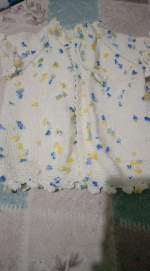 Beyaz zemin üzerine pastel renklerde küçük çiçek desenleri bulunan, bol kesim ve bohem tarzda örme kolsuz kız yeleği.