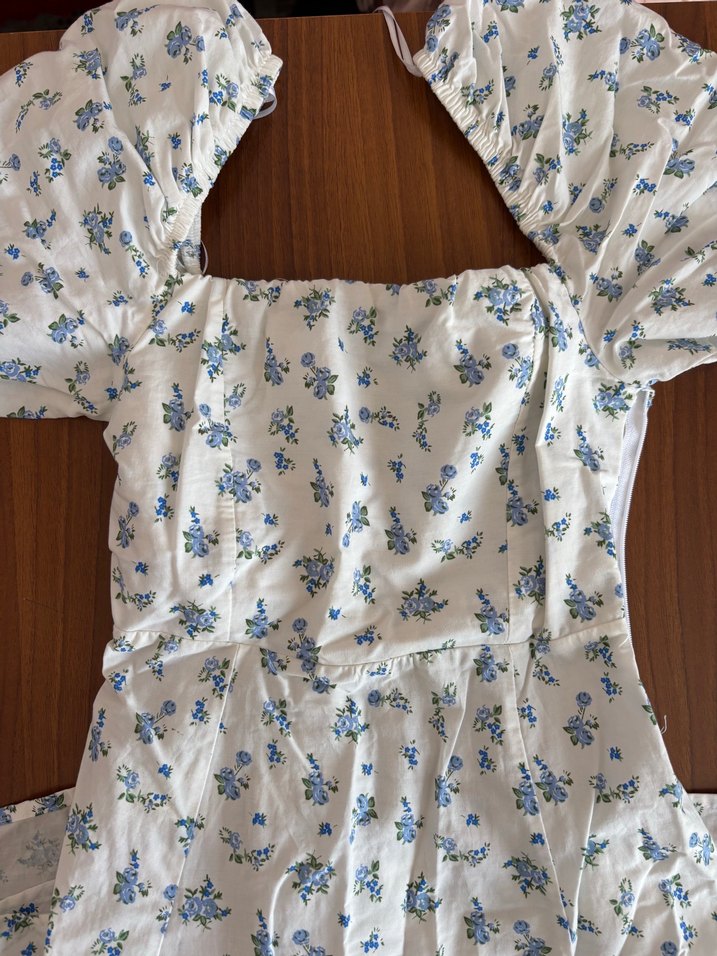 Beyaz çiçek desenli midi elbise, tekne yaka, kısa fırfırlı kollu ve vücuda oturan kesime sahip, bohem vintage tarzını yansıtıyor.