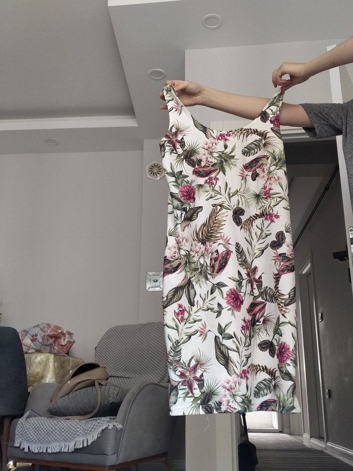 Beyaz çiçek desenli, straplez, midi boy, vücuda oturan hamile elbisesi. Hafif sentetik kumaştan, kolsuz ve drapeli bohem tarzda günlük kullanıma uygun.