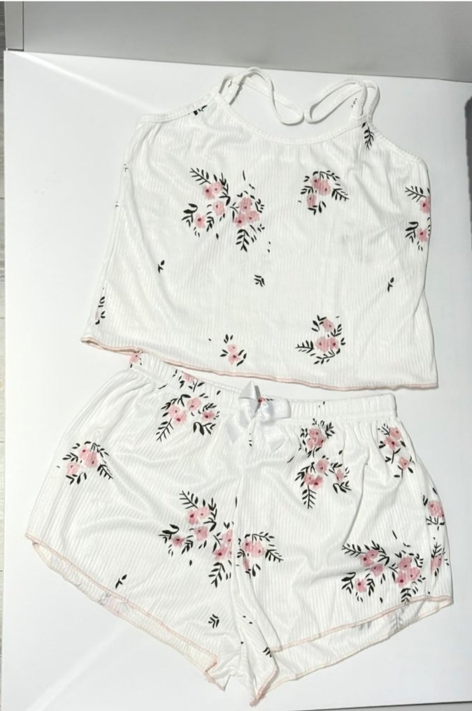 Geçişli beyaz mini pijama takımı, pastel çiçek desenli, askılı üst ve kısa şortlu, rahat ve bohem tarzda.