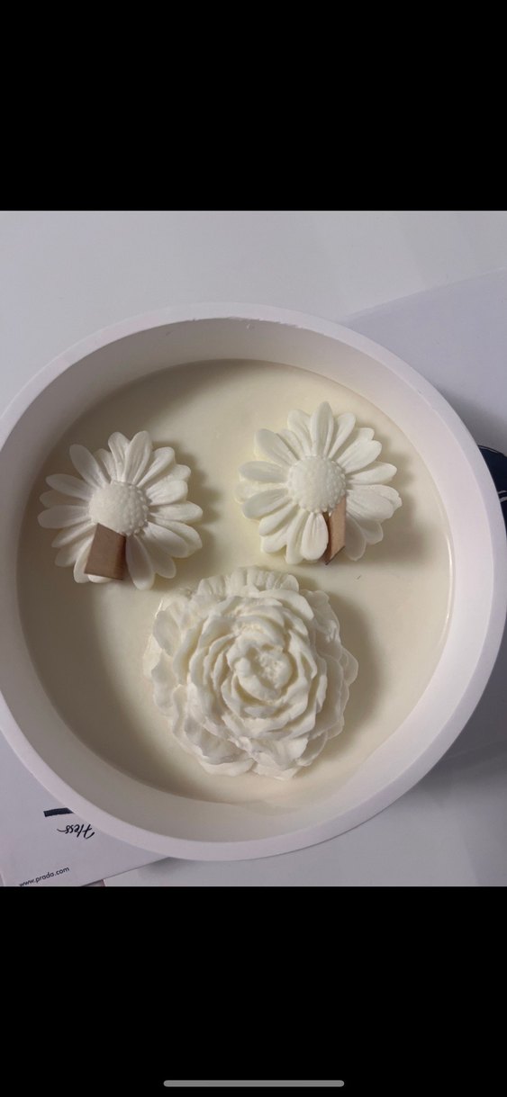 Yuvarlak muhafazada, iki papatya ve bir gül şeklinde beyaz çiçek desenli mumlar. SADECE SOYA WAX MUM KULLANILMIŞTIR . DUMANI ZARAR VERMEZ RAHATLATIR