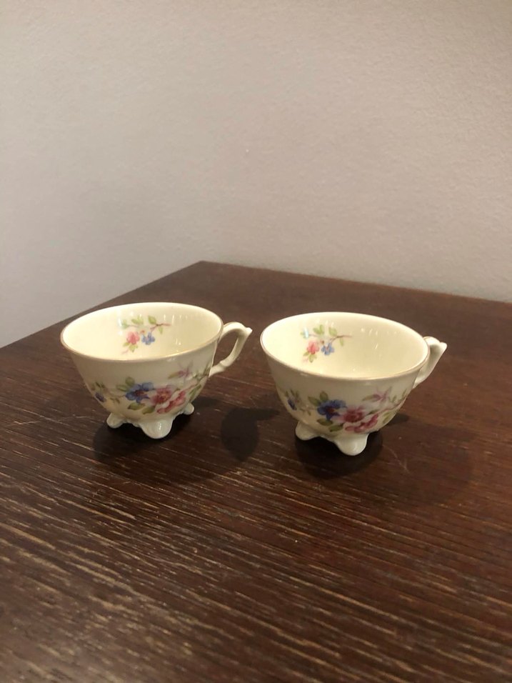 İki adet beyaz Vintage mini fincan, pastel çiçek desenleriyle süslenmiştir. Küçük kulpları ve üç ayak üzerinde durur.