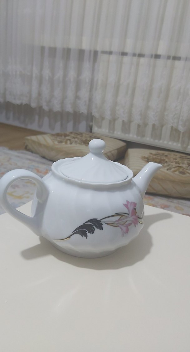 Beyaz porselen çaydanlık, pastel çiçek desenli ve yuvarlak kapaklıdır. ☕