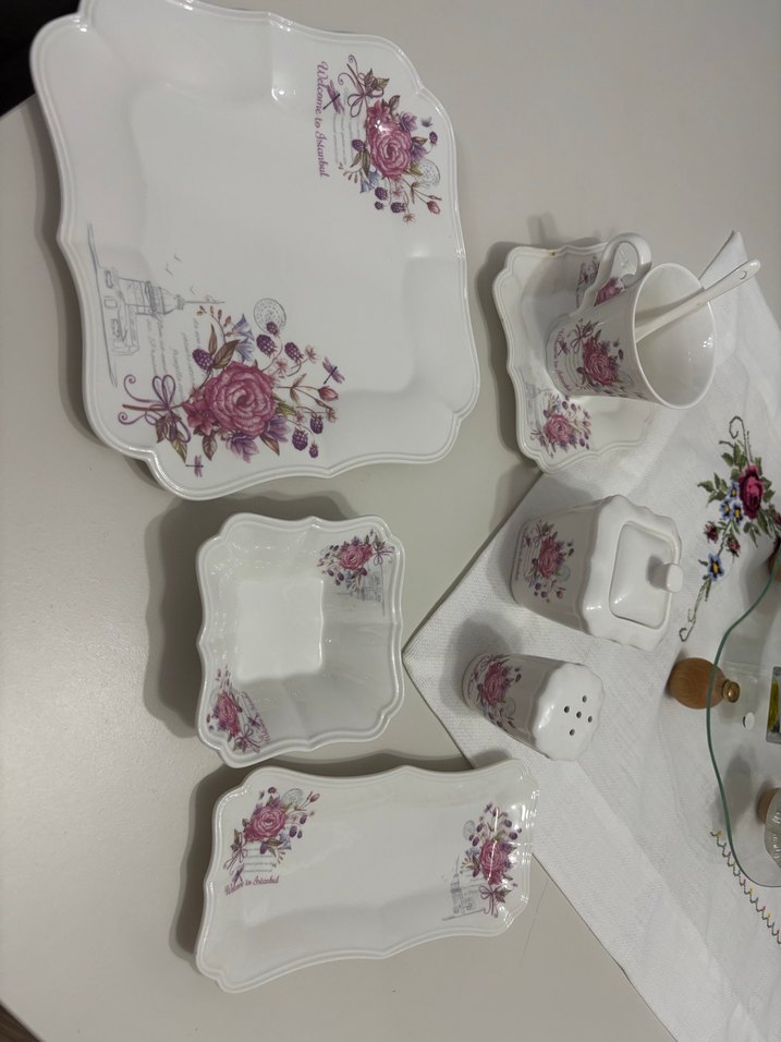 Beyaz porselenden yapılmış, hafif çiçek desenli süslenmiş geleneksel tarzda servis seti. Tabak, fincan, şekerlik ve tuzluk 2 adet reçellik 2 adette uzun tabağı var ortaya toplam 32 parça