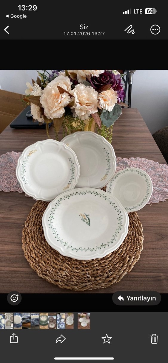 Beyaz porselen tabaklar, narin çiçek desenleri ve dalgalı kenarlarla şık bir sunum sağlar 24 parça 6 kişiliklidir yemek tabaklarında boya lekeleri mevcuttur
