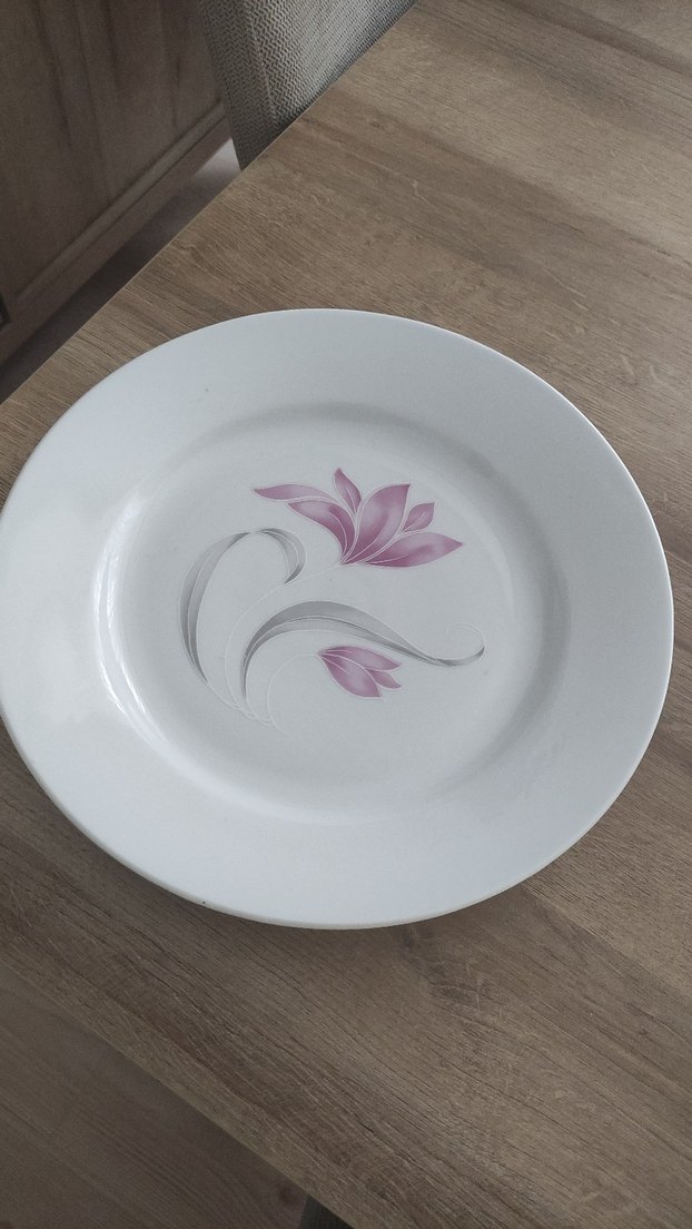 Ortası narin pembe çiçek desenli beyaz porselen tabak. Düz yüzeyli ve klasik yuvarlak şekildedir.