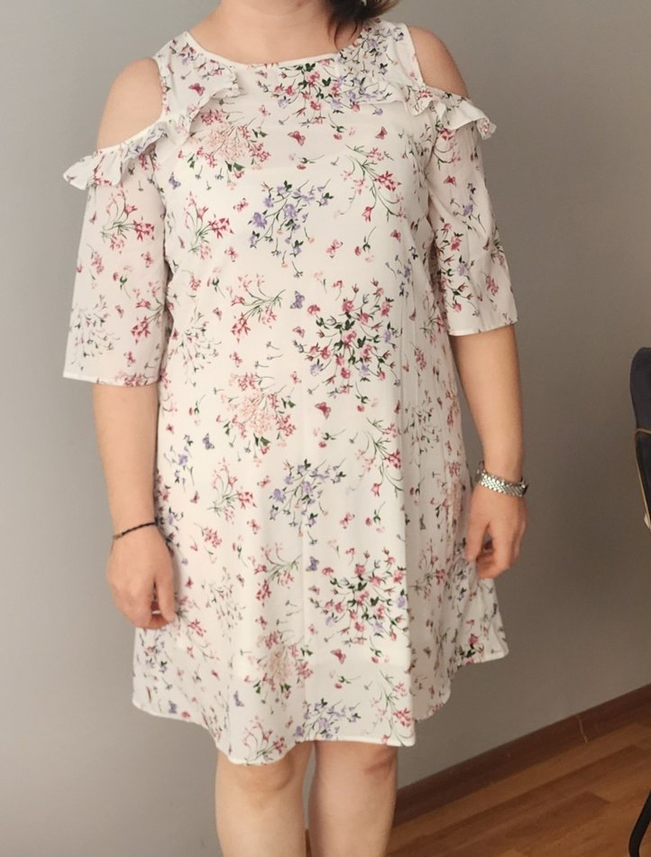 Beyaz renkte, çiçek desenli ve salaş kesime sahip kısa kollu günlük elbise. Bohem tarzda, fırfır detaylı ve straplez yaka özellikli.40 42 bedene uyumlu kol boyu 25 boyu 90