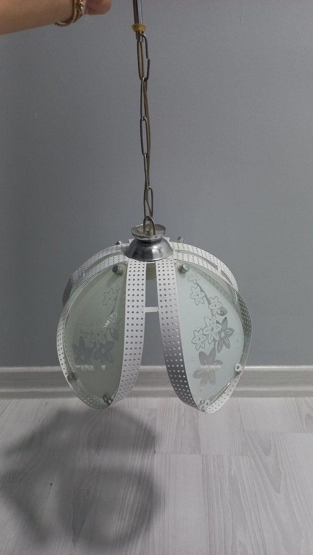 Çiçek desenli cam paneller ve metal çerçeveye sahip beyaz sarkıt lamba, zincirle tavana asılır. Yumuşak ve dekoratif ışık sağlar.