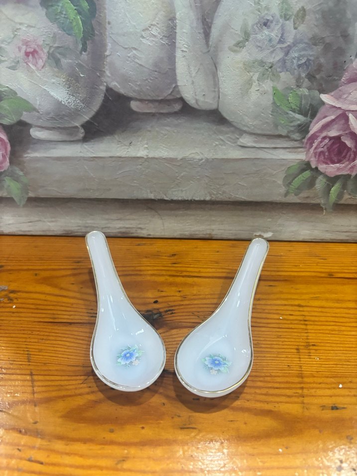 Beyaz seramikten yapılmış, mavi çiçek desenli ve parlak yüzeyli iki adet kaşık seti.