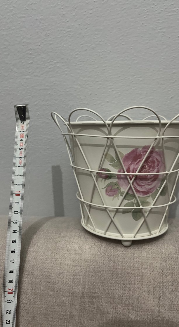Pastel çiçek desenli beyaz seramik vazo, metal tel çerçeveli. Yaklaşık 18 cm yüksekliğinde.