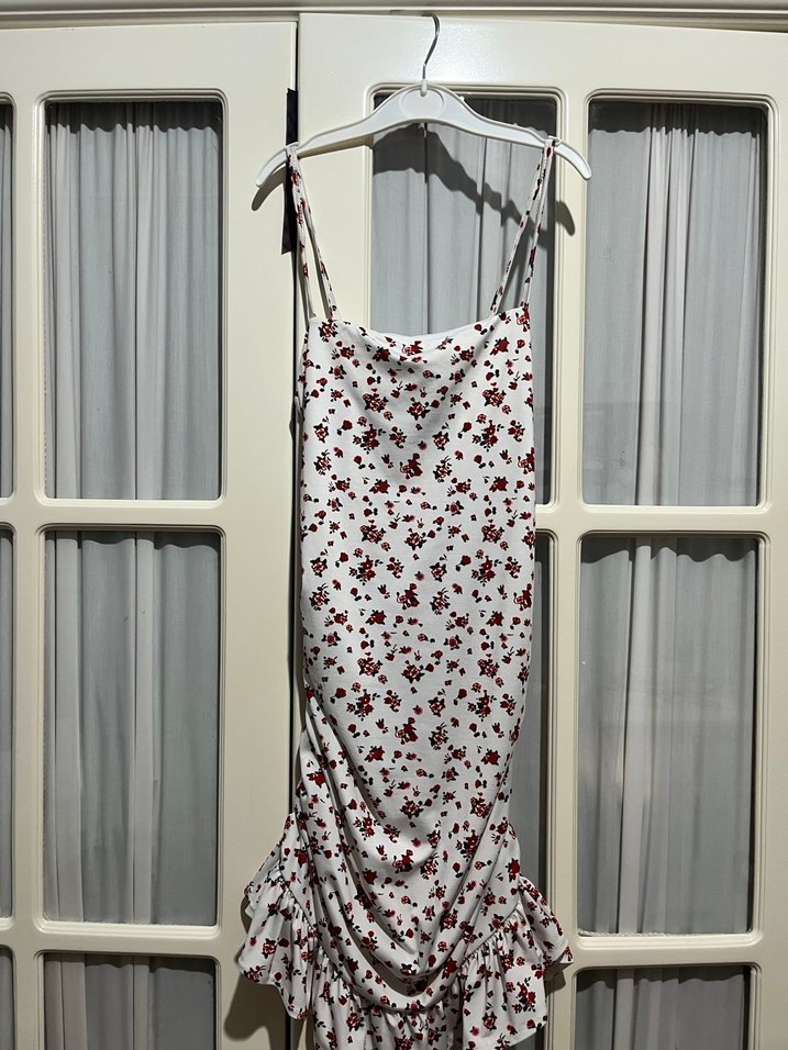 İnce askılı, drapeli ve beyaz zemin üzerine kırmızı çiçek desenli, uzun ve vücuda oturan elbise. Sokak stili ve Paris etkisi taşır.