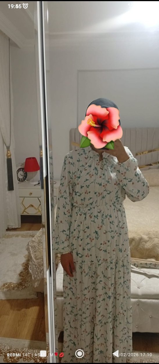 Beyaz renkte, uzun boy, yüksek yakalı ve ince askılı, bol kesim bohem elbise. Çiçek desenli ve fırfırlı, yumuşak sentetik kumaştan yapılmıştır. 46 beden yazıyor ama 42 beden uyumlu