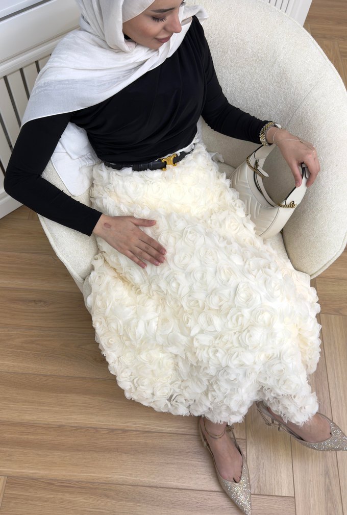 Beyaz Çiçek Desenli Uzun Drapeli Etek