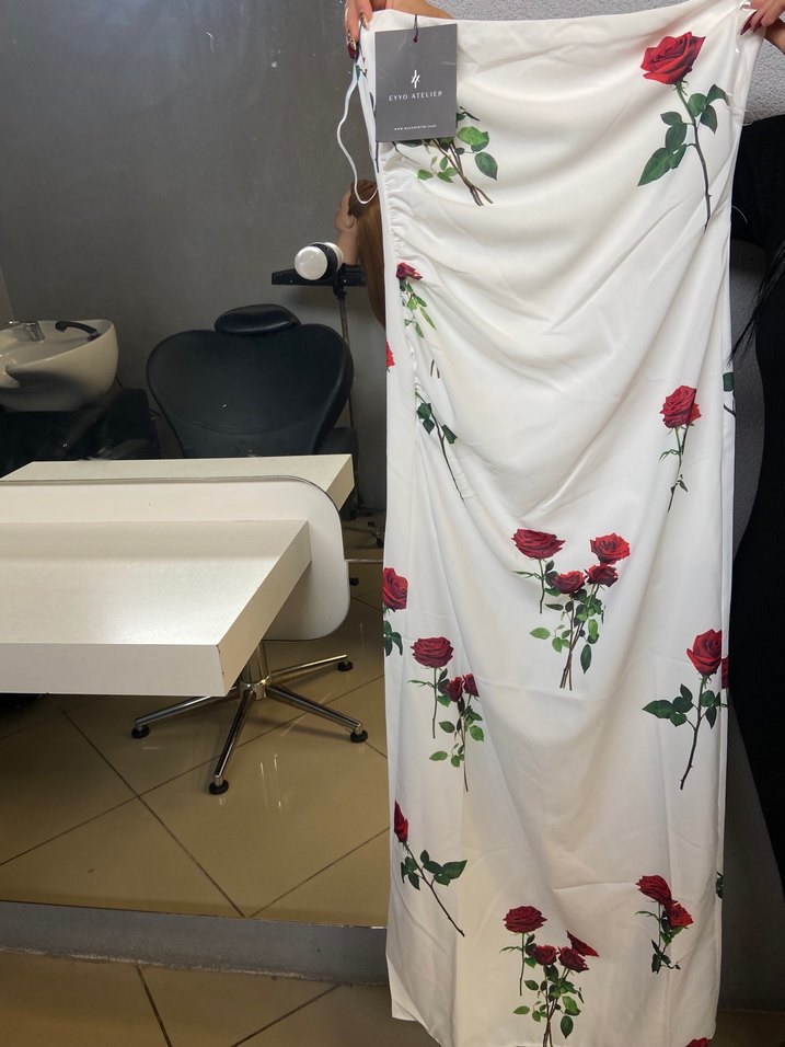 Beyaz renkte, kırmızı gül desenli, drapeli ve straplez uzun elbise. Kolsuz, vücuda oturan kesimiyle şık bir görünüm sunar. Sentetik kumaştan üretilmiştir. Etiketli hiç giyinilmedi uyguna koydum. Marka temsili.