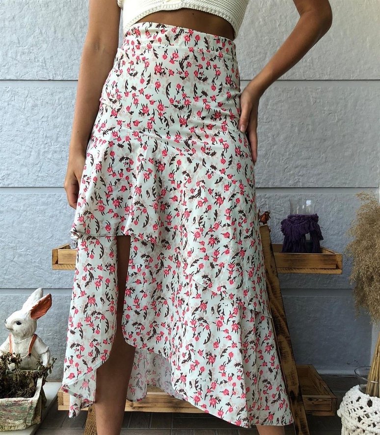 Beyaz Çiçek Desenli Uzun Etek