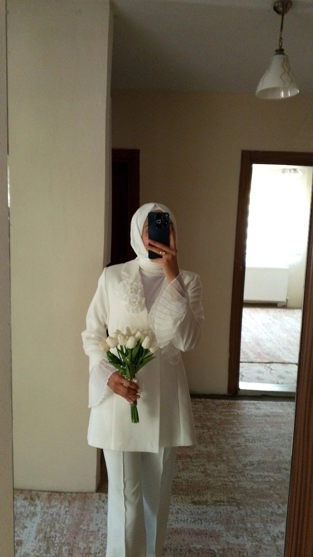 Yüksek yakalı, uzun kollu beyaz kadın takımı, şeffaf çiçek desenli ve ipeksi kumaştan. Midi boy ve düzenli kesim, sade ve mütevazı tarzlar için uygun. Nikahımda giydim. Şalı hediyedir