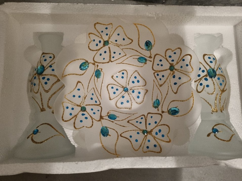 Mavi ve altın renkli çiçek desenleriyle süslenmiş beyaz vazo, hafif ve zarif bir tasarıma sahiptir.