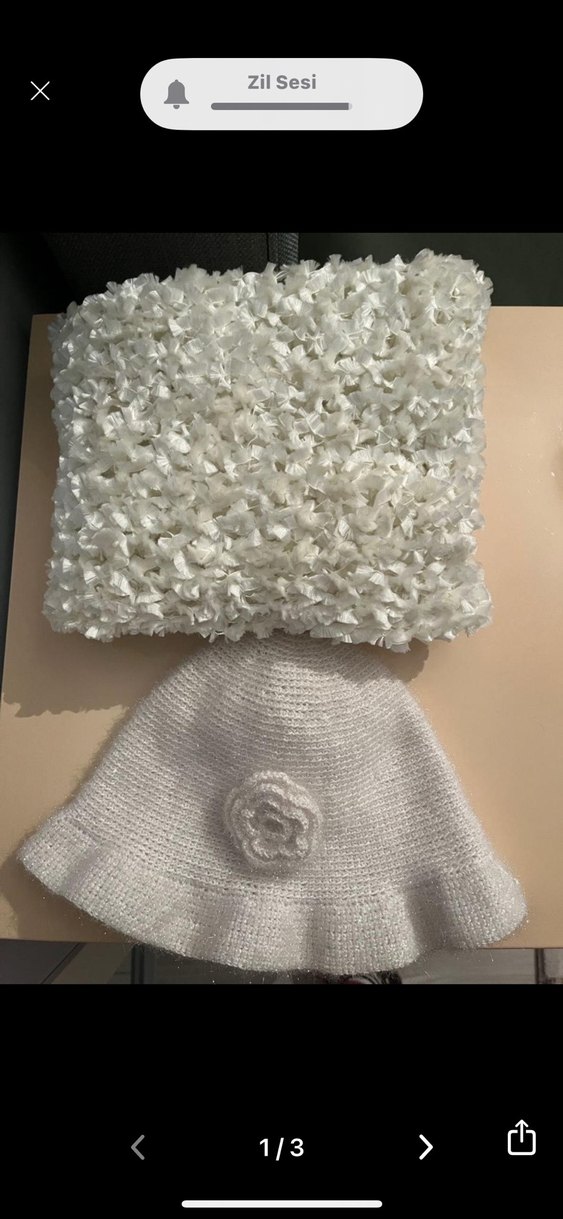 Beyaz yastık çiçek dokulu tasarıma sahip, yanında çiçek detaylı yumuşak örgü şapka bulunur. Konforlu ve şık dokunuş sunar. ️