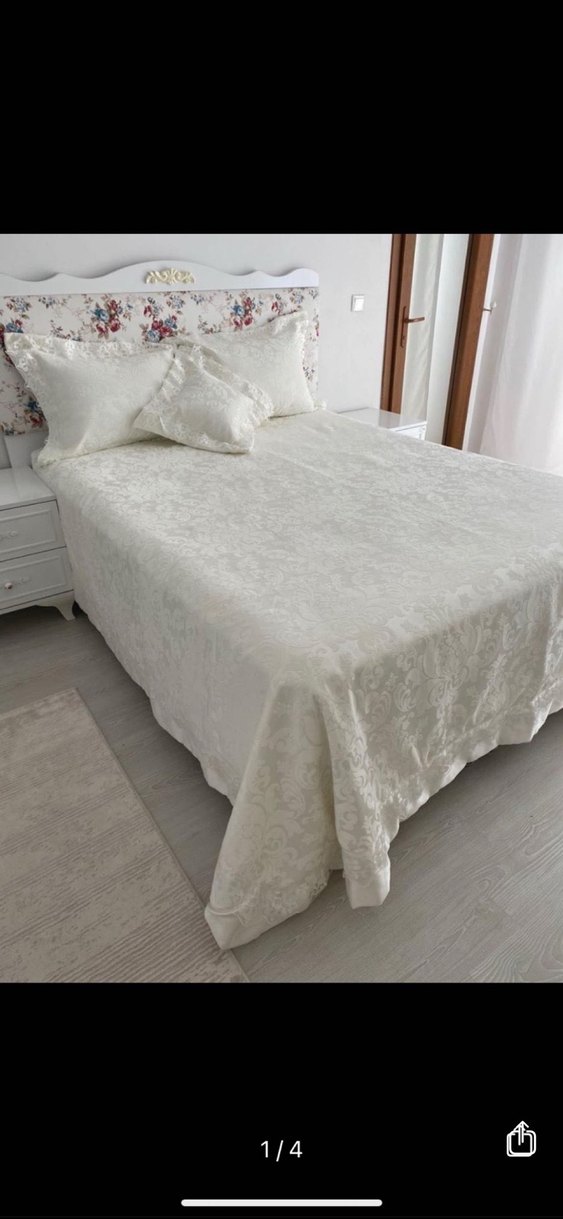 Yumuşak ve şık dokulu, açık renkli çiçek desenli beyaz yatak örtüsü. Yatak odasına zarif bir hava katar.