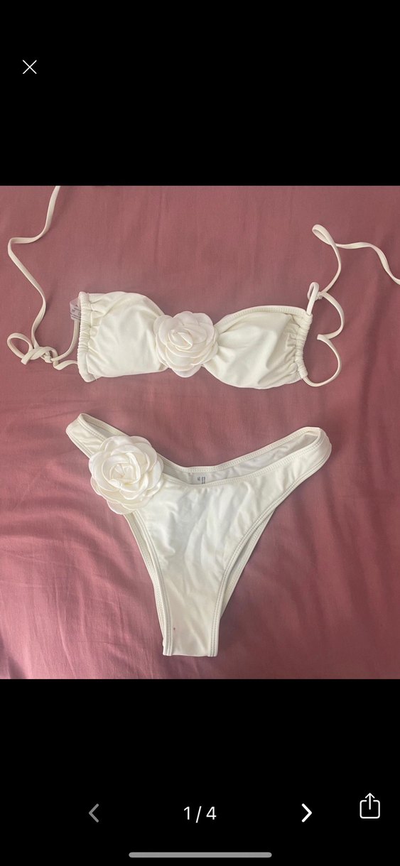 Beyaz renkte, çiçek süslemeli, askılı ve vücuda oturan bohem bikini. Minimalist ve şık tasarımıyla plaj için uygundur.