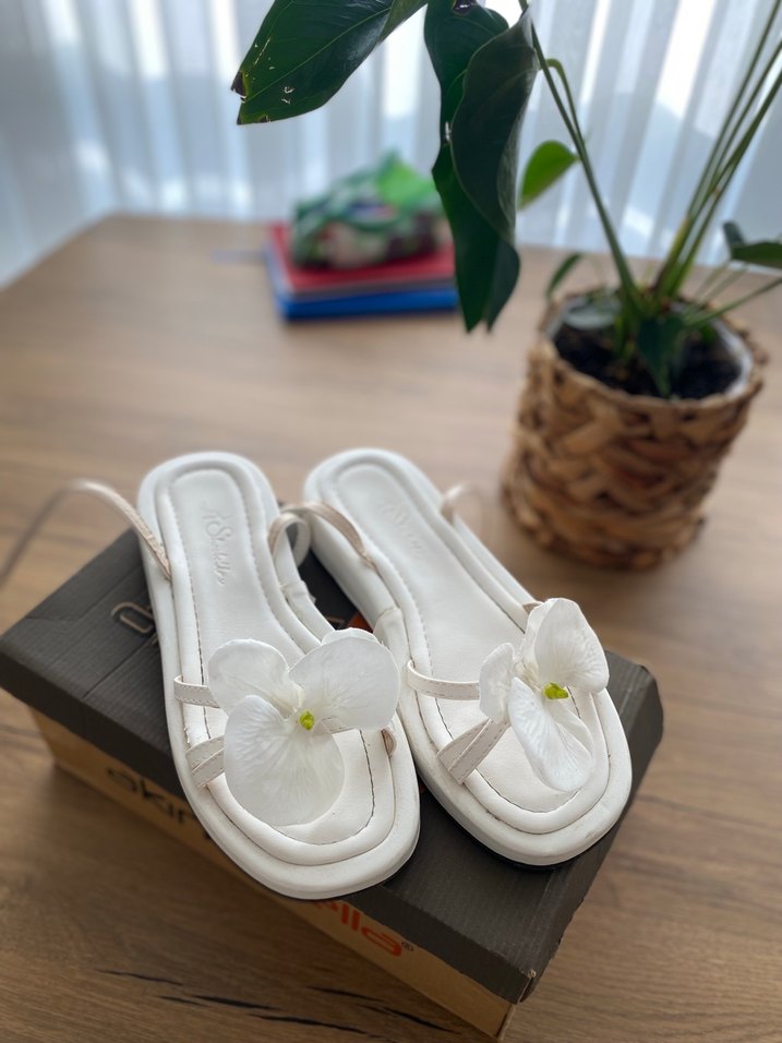 Yumuşak kauçuk malzemeden yapılmış, beyaz dolgu topuklu kadın sandaletleri. Çiçek detaylı ve tokalı kayışlı, minimalist düğün stilleri için uygun. Marka temsilidir