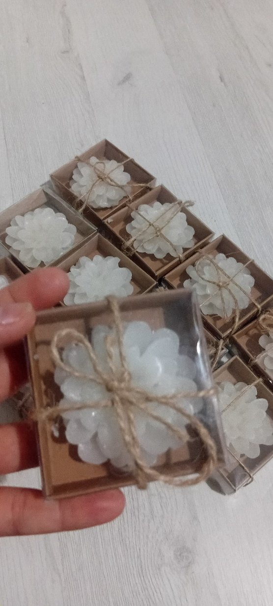 Karton kutuda, doğal ip ile bağlanmış beyaz çiçek şeklinde mum seti. Dekoratif kullanım için uygundur. ️