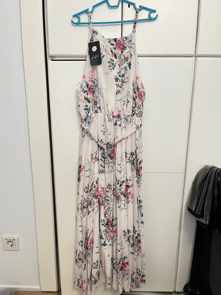 İnce askılı, straplez, bol kesim uzun elbise, pileli detaylı ve hafif çiçekli desenlidir, bohem tarz için uygundur. 2 ci fotoğraftaki modelin aynısı sadece bende ki kumaş çiçekli çok hiç kullanılmamış