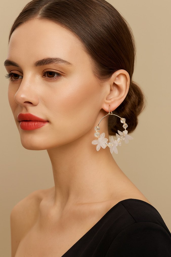 Beyaz çiçek desenli, boncuk detaylı midi uzunlukta, modern tarzda küpeler. Düğün ve klasik zarafet için uygundur.