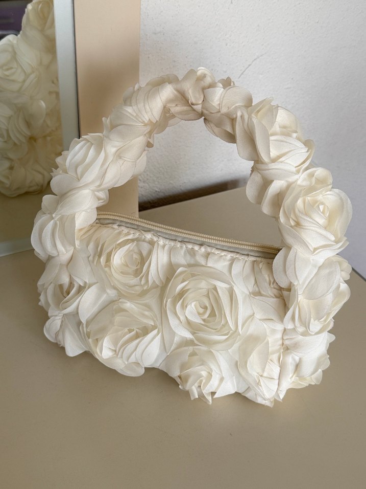 Bu beyaz kadın çantası, sentetik kumaş üzerinde fırfırlı çiçek desenleriyle bohem tarzda, düğün ve şık etkinlikler için uygundur.