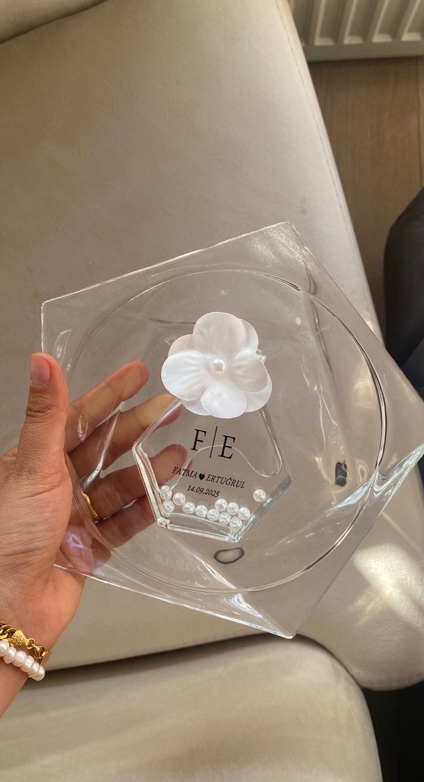 Beyaz çiçek ve inci detaylı, kişiye özel baş harfler ve tarih içeren şeffaf dekoratif hediye plağı .