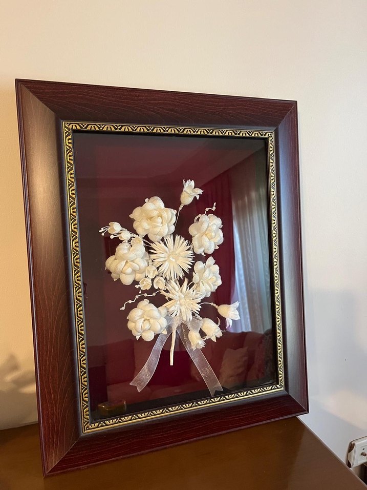Koyu ahşap çerçevede, kurdeleli beyaz çiçeklerden oluşan dekoratif tablo. İpek Koza’sından yapılmış tir