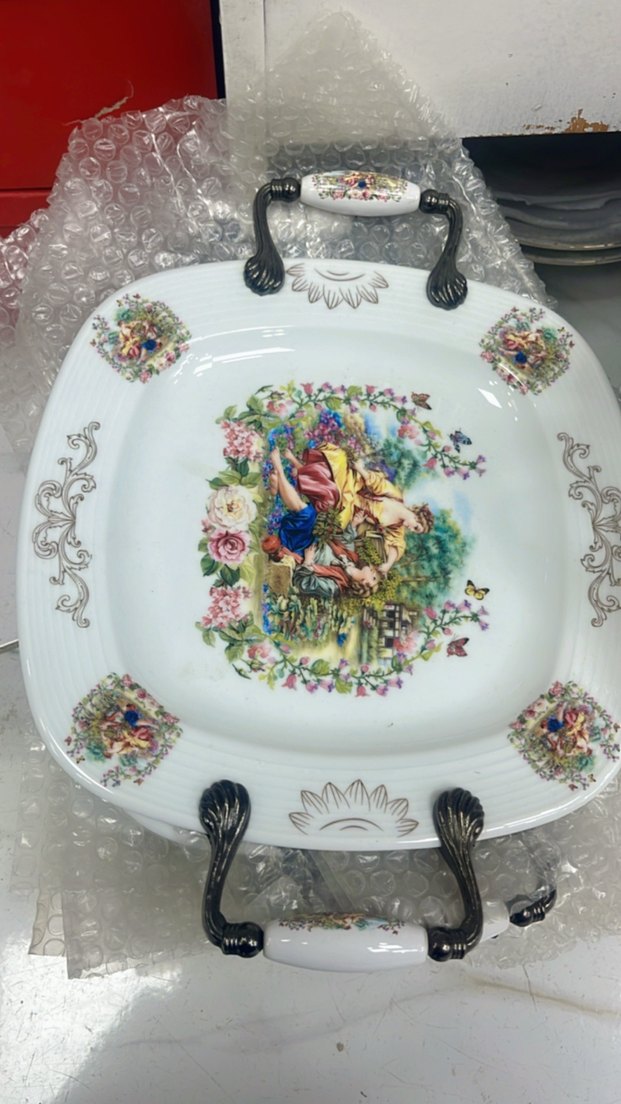 Beyaz porselen tabak, çiçek desenleri ve dekoratif kulplar ile klasik tarzı ve işlevselliği bir araya getiriyor.