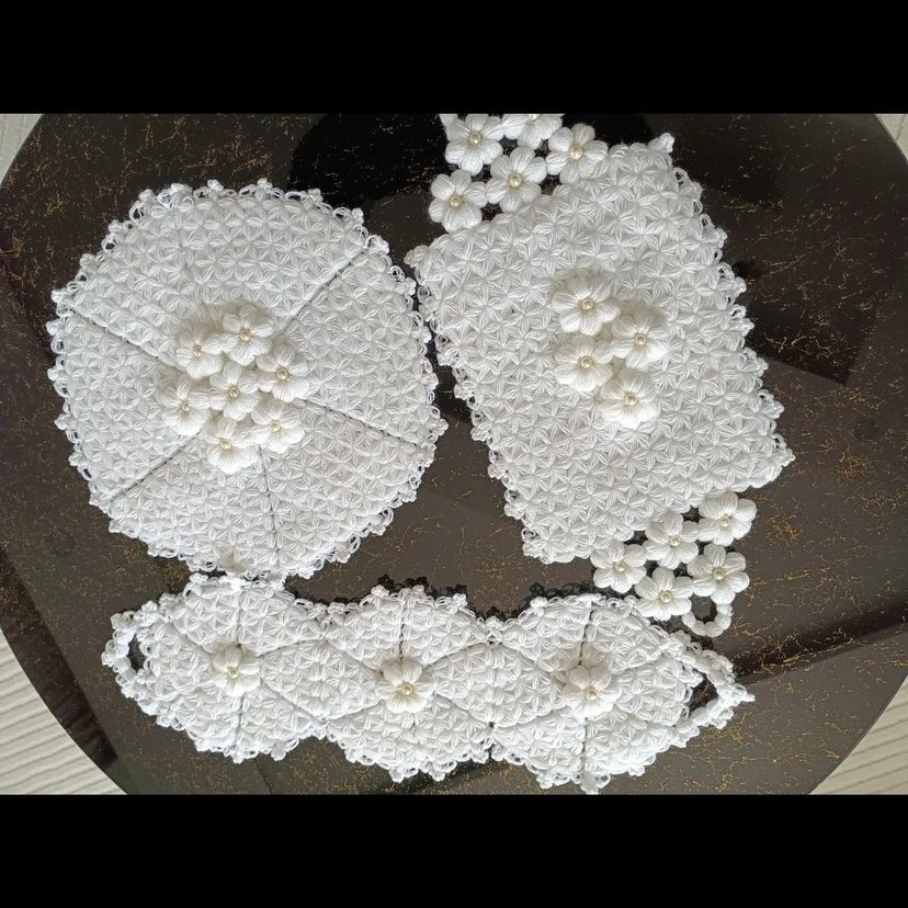 Bu geleneksel beyaz el örgüsü lif seti, zarif çiçek desenleriyle ev dekorunuza ince bir dokunuş katıyor.