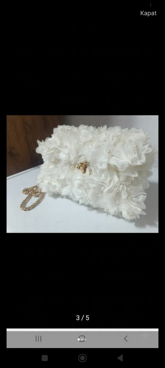 Yumuşak sentetik kumaştan, inci detaylı çiçekli fırfırlarla süslenmiş beyaz kadın çanta. Altın zincir askılı, düğün ve özel günler için uygun.