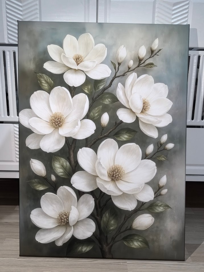 Gri arka planda beyaz çiçekler ve yeşil yapraklar içeren sakin ve zarif bir tablo.