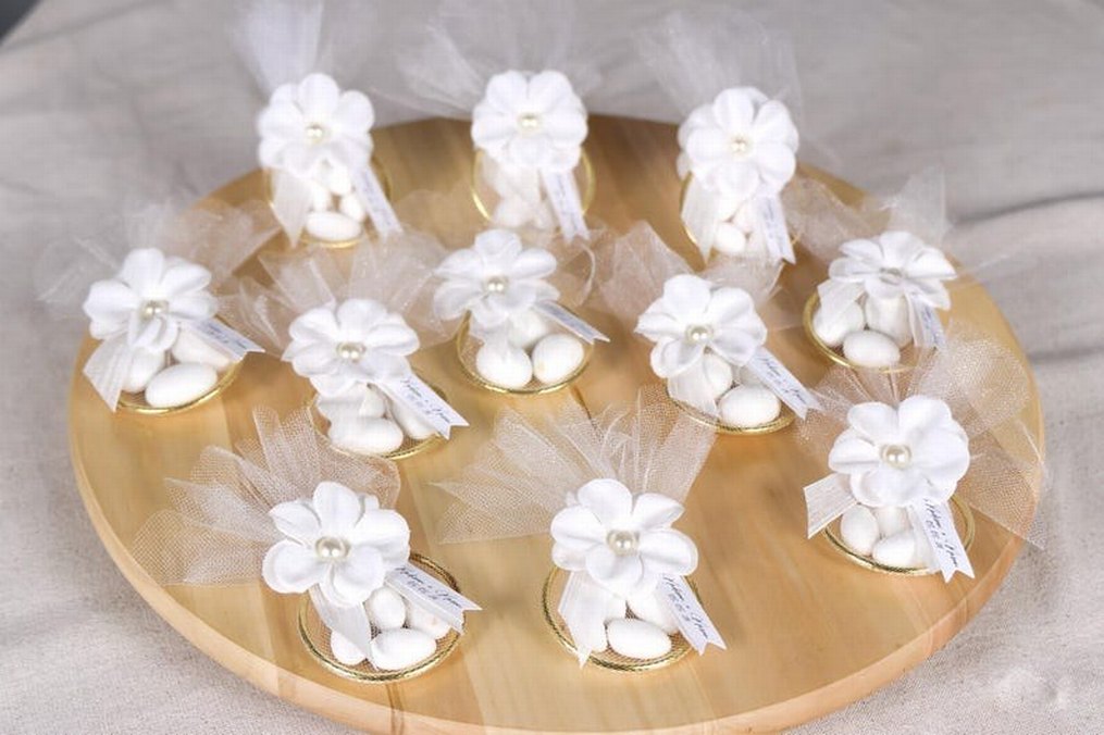Tül ve inci süslemeli beyaz çiçekli nikah şekeri, özel günler için uygun .