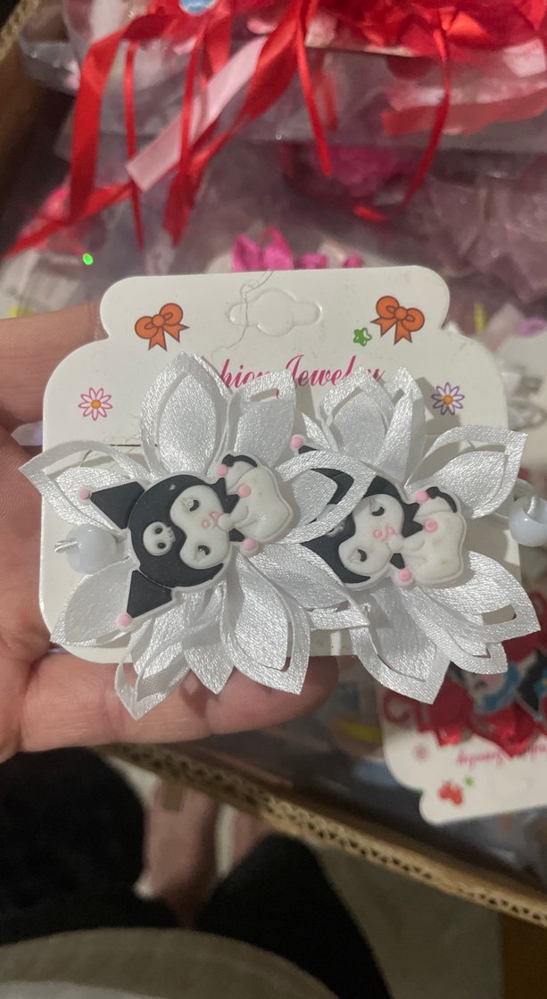 Beyaz renkte, çiçek desenli fiyonk ve kedi figürlü çocuk saç tokalarıdır, bohem ve rock punk tarzına uygun renkli bir görünüm sunar.