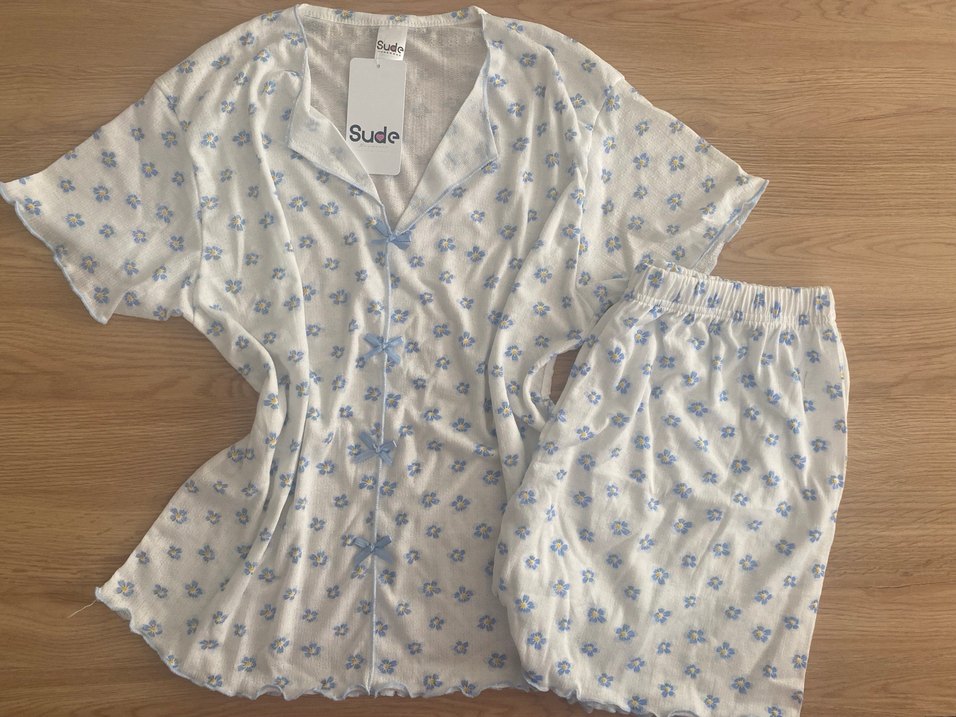 Beyaz, pastel çiçekli desenli, kısa kollu, bol kesim mini pijama takımı. Rahat ve konforlu, Sude markası. M L XL XXL