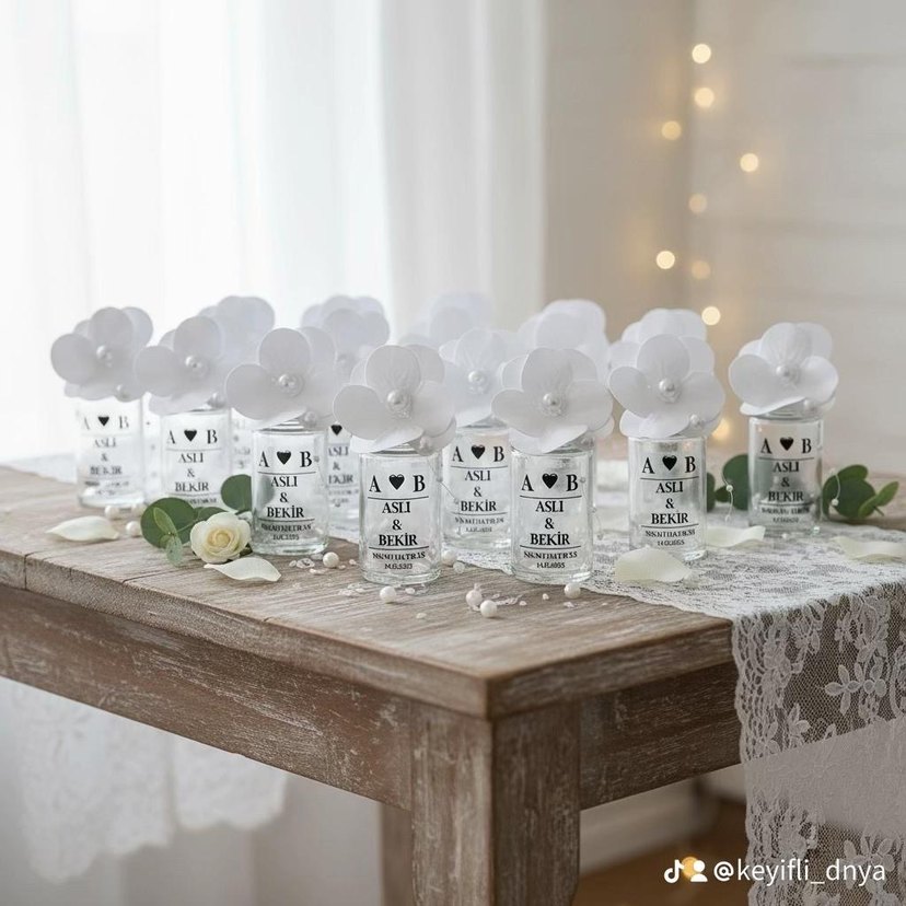 Üzerinde isimlerin yazılı olduğu beyaz çiçek şeklinde kişiye özel esanslı şişeler . Zarif ve hafif tasarımıyla dikkat çeker.