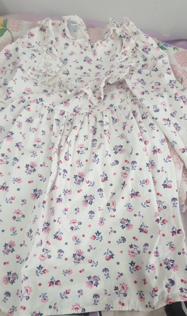Beyaz zeminde pastel renkli çiçek desenli, uzun kollu, kız çocuk elbise.