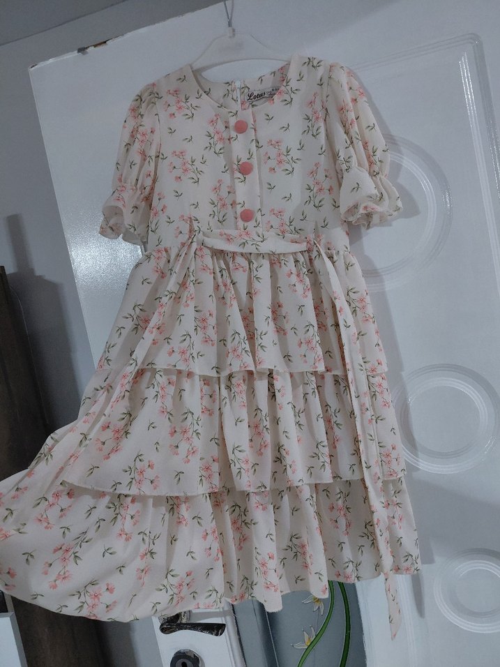 Yumuşak sentetik kumaştan, kısa kollu, beyaz üzerine pastel çiçek desenli, bol kesim ve fırfırlı kız çocuk elbisesi. #kızçocukelbise