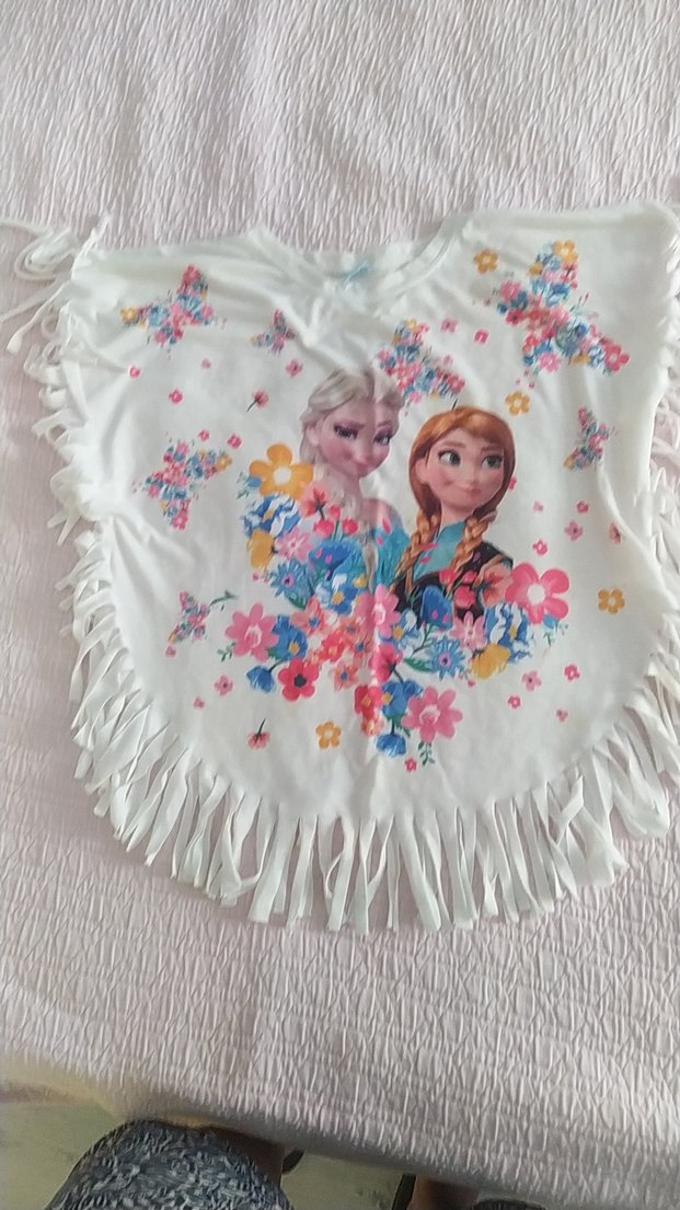 Bol kesim, kısa kollu, yuvarlak yaka kız çocuk panço. Çiçek ve karakter baskılı, püsküllü ve bohem tarzda.