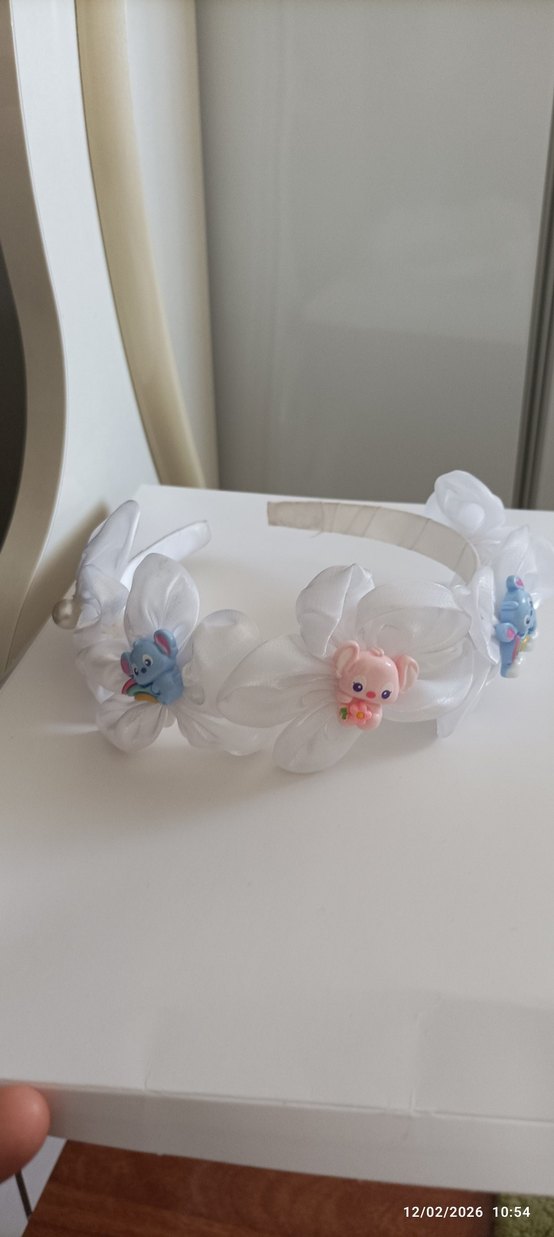 Beyaz kurdeleli, çiçek detaylı ve renkli küçük hayvan süslemeli çocuk saç bandı. Bohem ve retro tarzlar için uygundur.