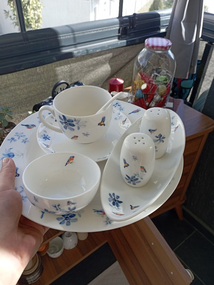 Beyaz porselenden yapılmış, mavi çiçekler ve küçük kuş desenleri içeren kahvaltı seti. Set içinde 12 fincan, 12 tabak, 8 kase , 4kayık tabak,12 çay kaşığı ve 2 tuzluk- 2 biberlik bulunur. ☕ orjinal kutusunda gönderilecektir.