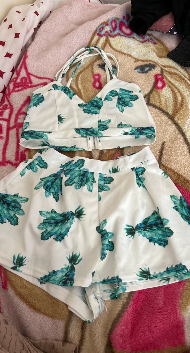 Beyaz mini tulum, gevşek kesim, askılı ve straplez yakaya sahip, çiçek desenli ve sentetik kumaştan, dantel detaylı bohem tarzda.